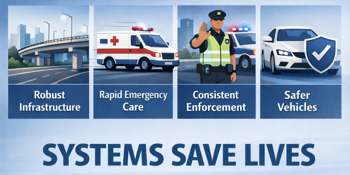 In contrast, middle-income countries often experience higher fatality rates from comparable crash volumes. Here, the issue is less about the frequency of crashes and more about their consequences. Delays in emergency response, limited access to trauma care, and road environments that offer little protection can turn survivable injuries into fatalities. This contrast highlights an important lesson: reducing deaths is not solely a matter of individual behavior or enforcement. It depends heavily on whether systems are in place to absorb impact, respond quickly, and sustain life after a crash occurs.